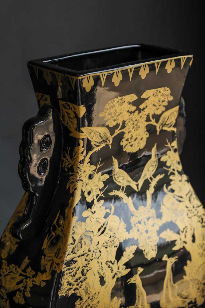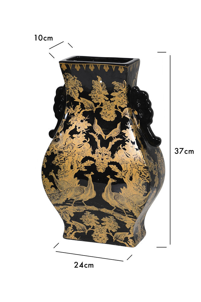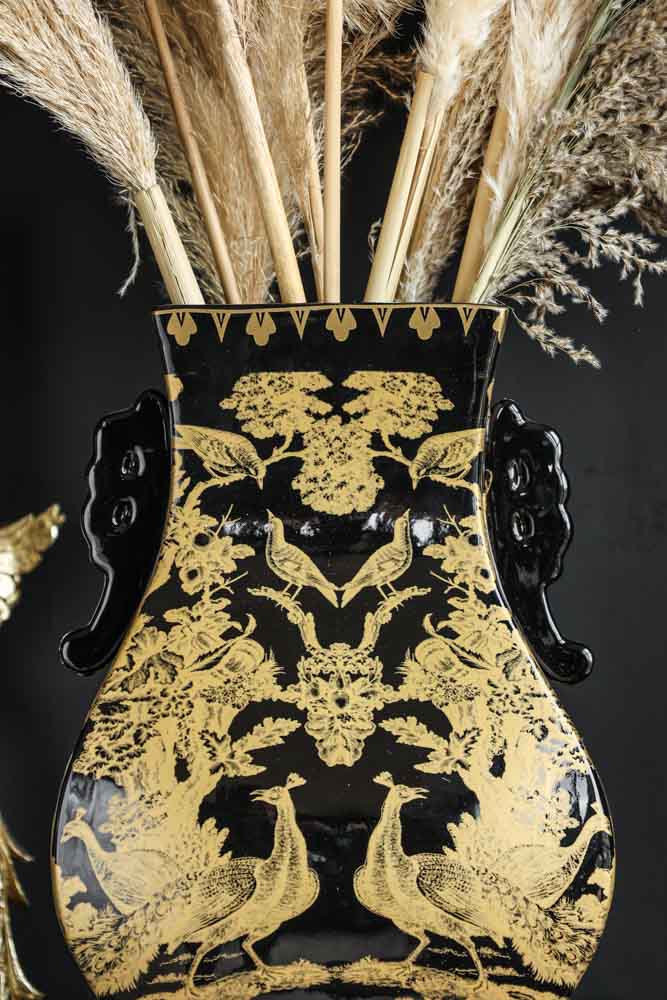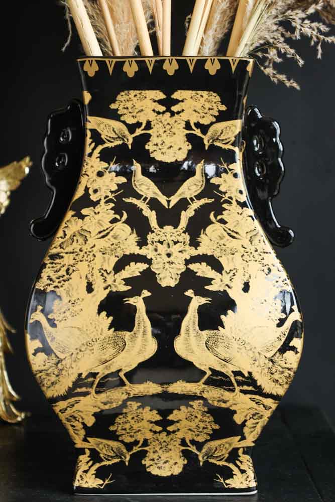 Showcasing an intricate ornate design, the Black and Gold Chinoiserie Porcelain Vase is a beautifully embellished piece. This traditional vase features a delightfully unique curved shape in a grand black and gold chinoiserie symmetrical pattern with elegant peacocks and trees. Adorned with black decorative handles and a wide opening, this porcelain vase would look even better displayed with dramatic wispy stems, elevating the drama of the piece in eye-catching style.