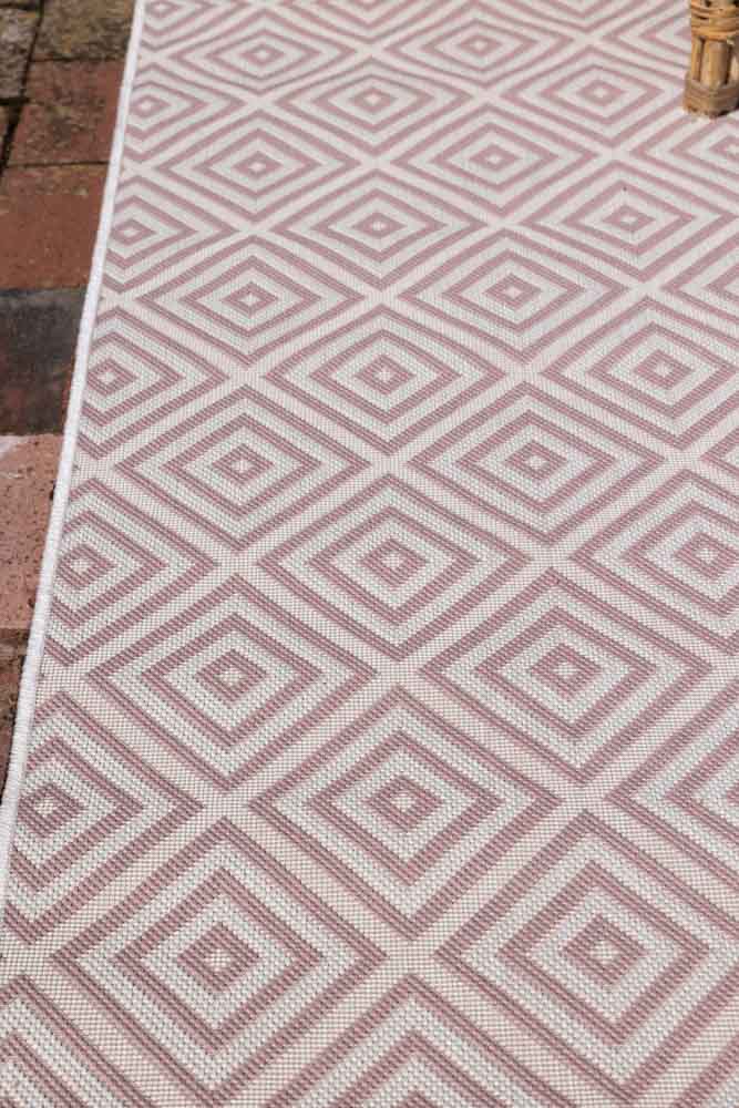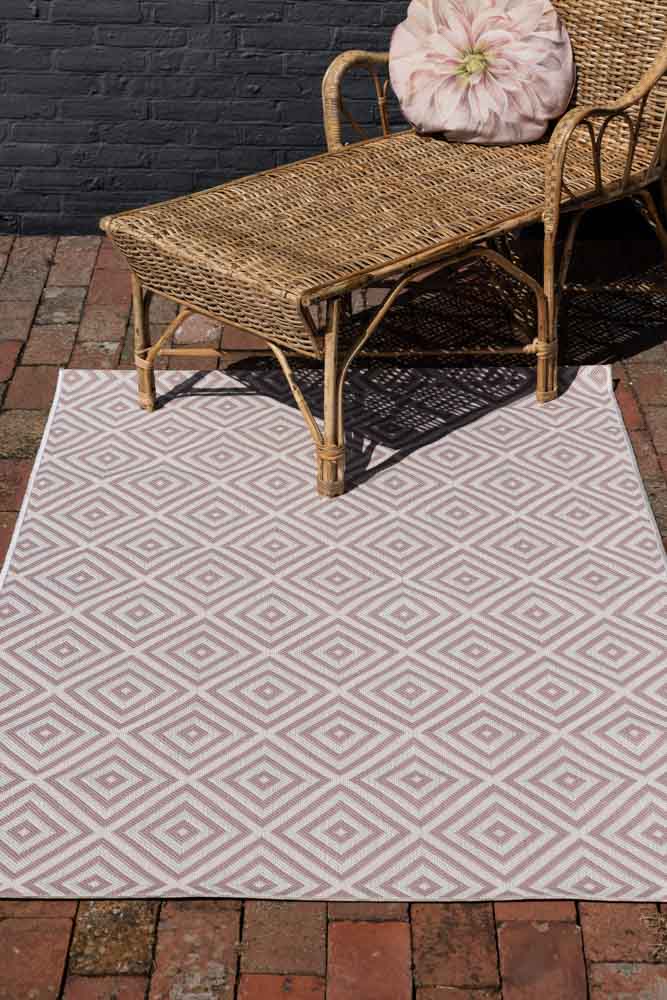 The Pink Diamond Indoor/Outdoor Garden Rug is THE outdoor rug of your dreams. Pink is often regarded as the most fun and youthful shade of the colour spectrum and looks gorgeous with nature. From the power couple pairing of pink and green to pink’s ability to soften natural materials such as stone, brick and terracotta, we believe every garden needs a playful pop of pink. With that in mind, the pink diamond garden rug answers our prayers! Designed in dusky rose and cream hues, this outdoor rug introduces a classic diamond geometric pattern to the garden and is available in three sizes to suit a range of outdoor spaces. Perfect for creating an outdoor living room with cosy cushions, lanterns and comfy seats, this pretty pink rug provides a go-to spot for picnics, al fresco entertaining and lazy afternoons spent soaking up the sun. To celebrate the power of pink, we recommend pairing this rug with pots of pink geraniums for a final tonal touch.