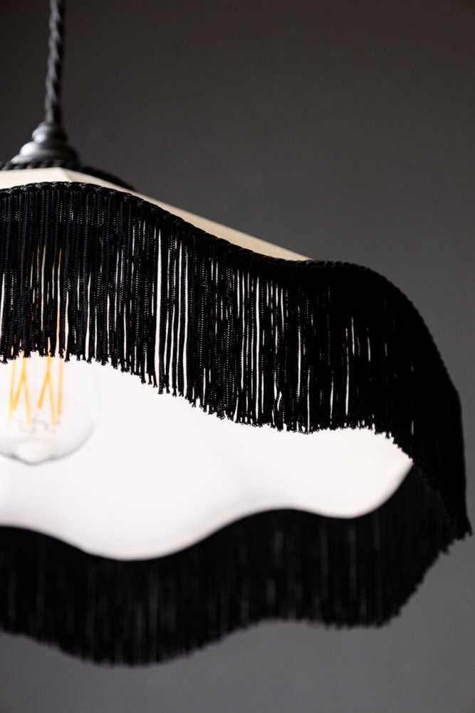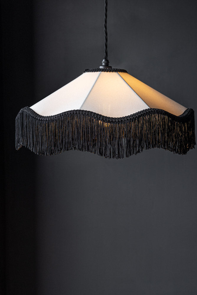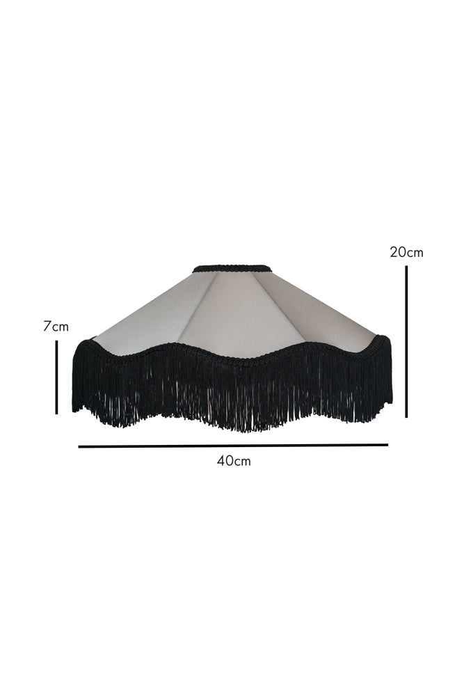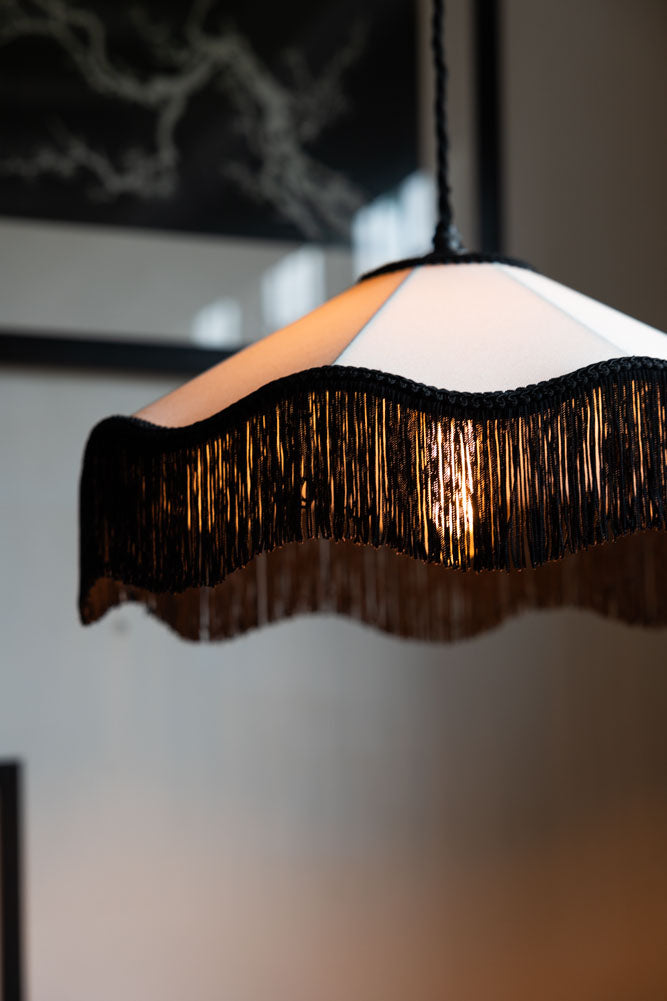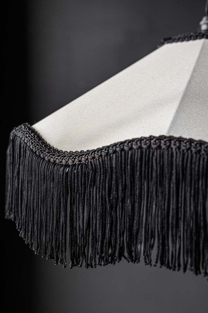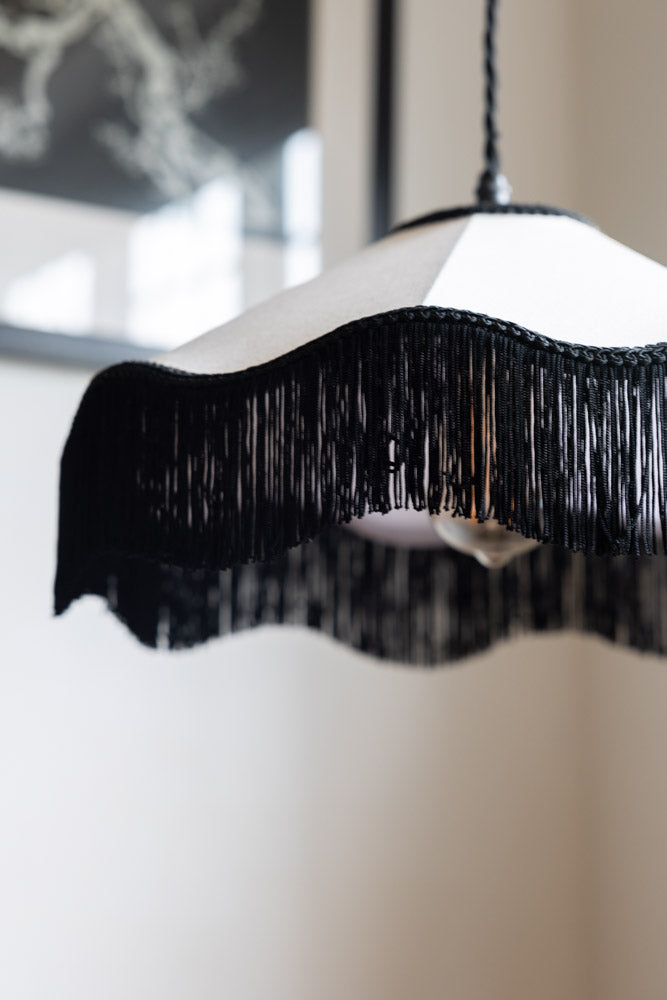 The Black & Cream Tassel Ceiling Light Shade introduces classic beauty to the ceiling of your home. As an iconic symbol of vintage style, fringed lampshades create a feeling of Art Deco decadence in any room, from your bedroom to the living space. The perfect size for smaller rooms where you don’t want to compromise on maximalist glamour, the tassel lampshade offers an instant update and is designed to fit existing pendant fixtures for ease and impact. With a timeless monochrome colour palette, the subtle cream fabric of the shade contrasts the wave of bold black tassels and matching black trim. A gorgeous pendant light shade that creates a fabulous final touch to vintage-inspired decor, the Black & Cream Tassel Ceiling Light Shade is chic, affordable and - if you ask us -the ultimate expression of modern glamour. - Cream pendant lamp shade with black fringing - Measures: H20cm x Dia. 40cm | Height of fringe - 7cm - Requires an E27 max 40W bulb - Also available in Green & Pink or Black & Gold