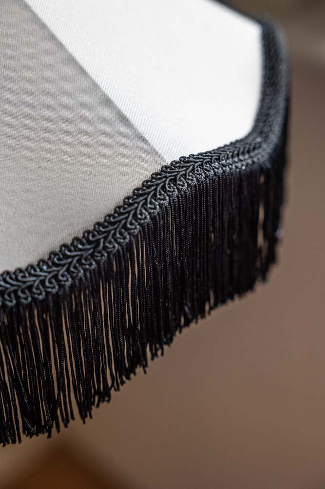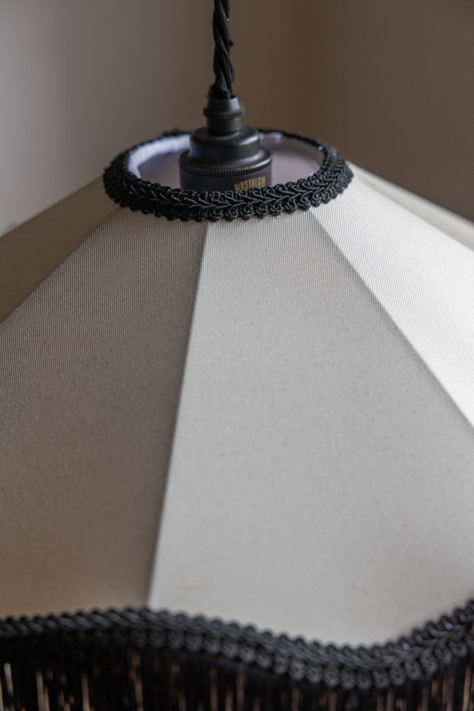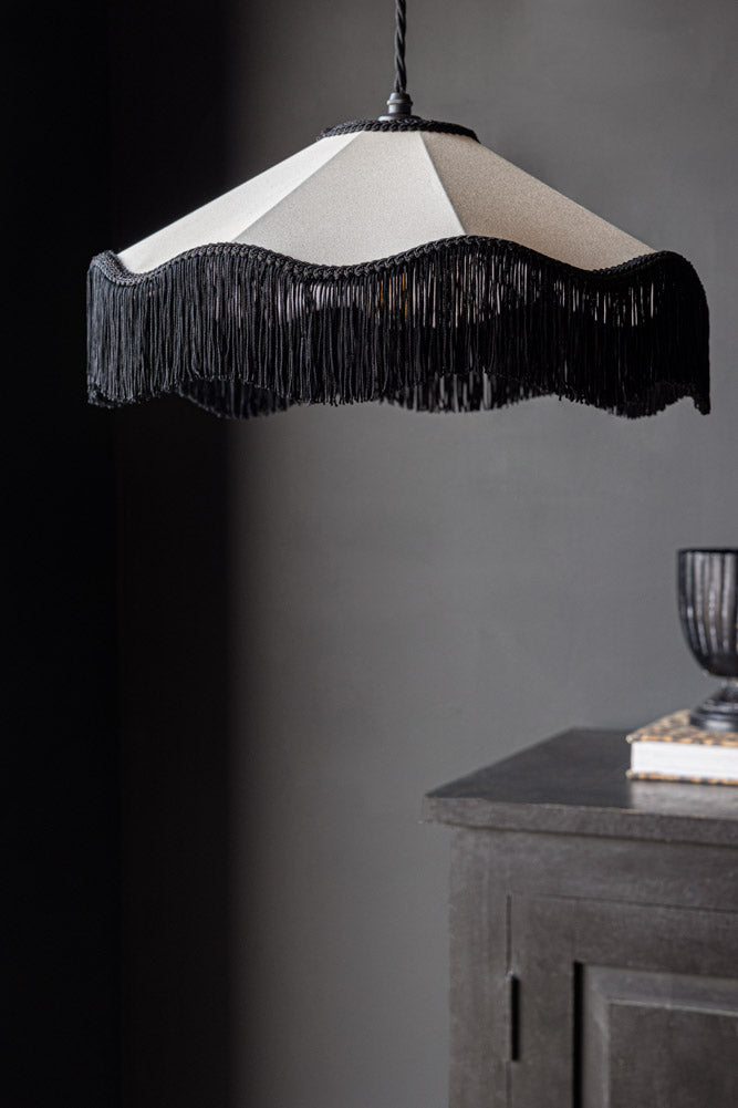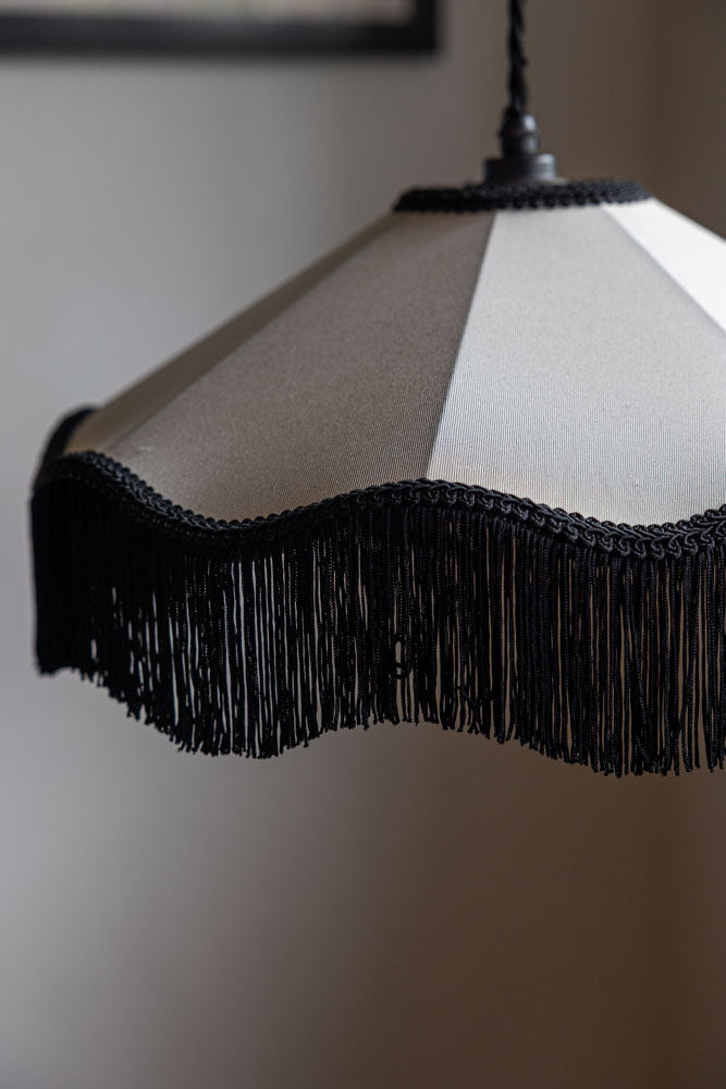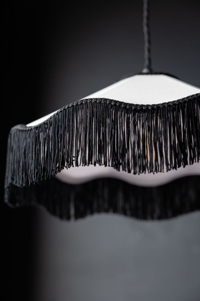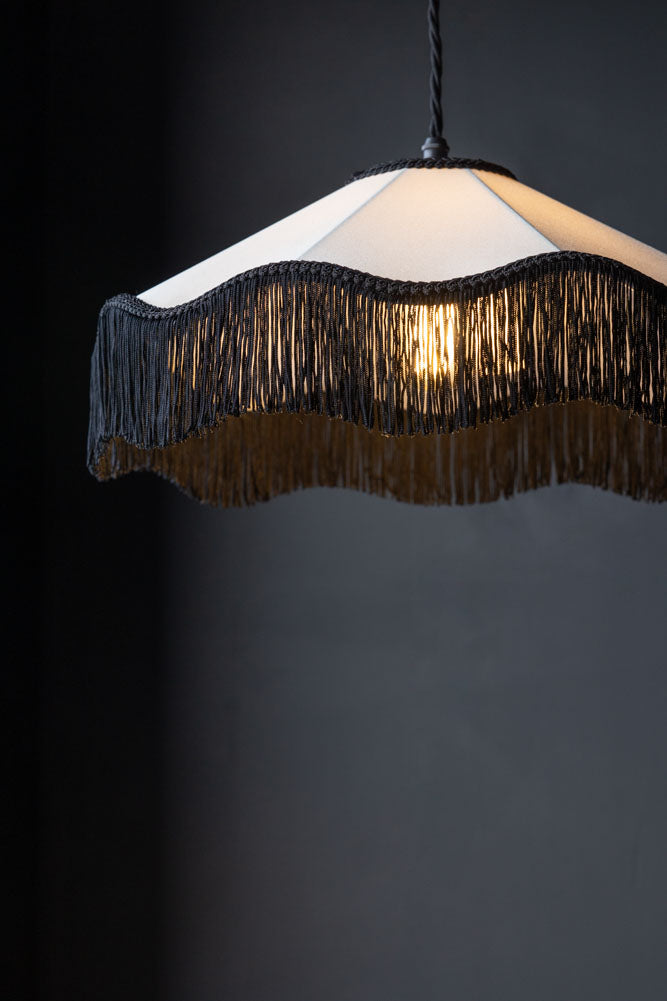 The Black & Cream Tassel Ceiling Light Shade introduces classic beauty to the ceiling of your home. As an iconic symbol of vintage style, fringed lampshades create a feeling of Art Deco decadence in any room, from your bedroom to the living space. The perfect size for smaller rooms where you don’t want to compromise on maximalist glamour, the tassel lampshade offers an instant update and is designed to fit existing pendant fixtures for ease and impact. With a timeless monochrome colour palette, the subtle cream fabric of the shade contrasts the wave of bold black tassels and matching black trim. A gorgeous pendant light shade that creates a fabulous final touch to vintage-inspired decor, the Black & Cream Tassel Ceiling Light Shade is chic, affordable and - if you ask us -the ultimate expression of modern glamour. - Cream pendant lamp shade with black fringing - Measures: H20cm x Dia. 40cm | Height of fringe - 7cm - Requires an E27 max 40W bulb - Also available in Green & Pink or Black & Gold