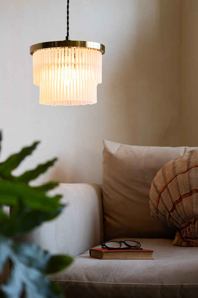 The arrival of the Gold Tiered Glass Easyfit Ceiling Light Shade helps create a glamorous chandelier look with ease. Easyfit ceiling lights are one of the best ways to update a room, and most importantly, the gold & glass chandelier shade doesn’t require an electrician to be fitted. Simple and easy to install, this light works with your existing light fitting to save on all the usual stress of changing a ceiling light. Perfect for rented homes, the easyfit ceiling light helps introduce your personality to any space. After all, style starts from the ceiling down! As a modern take on classic glass chandeliers, the gold frame reveals two tiers of gorgeous, frosted glass droplets that catch the light throughout the day. Get your glam on now!